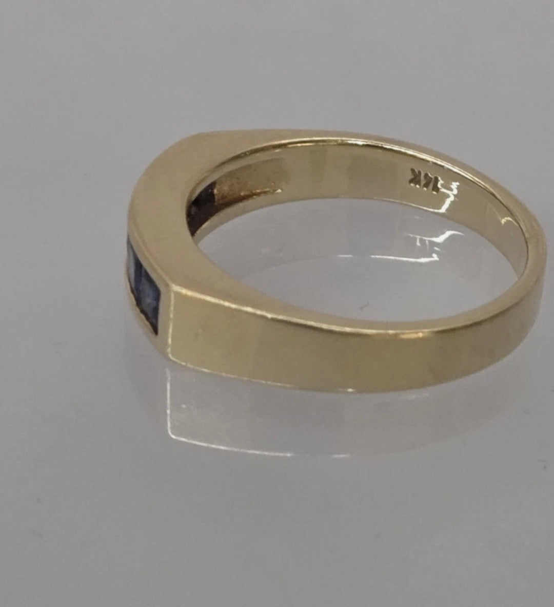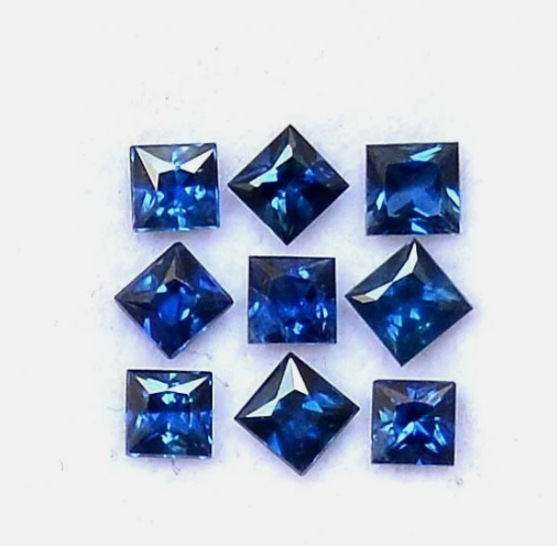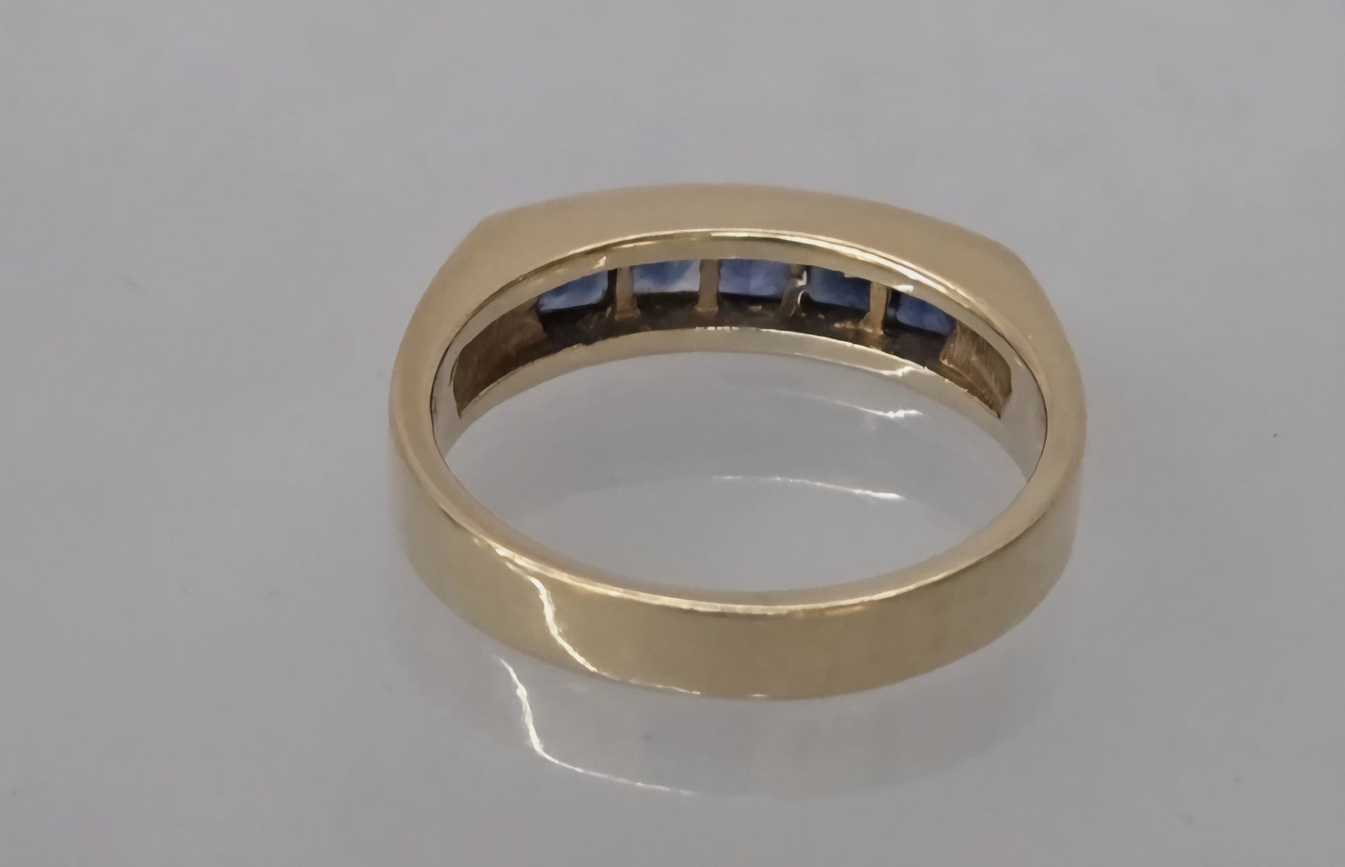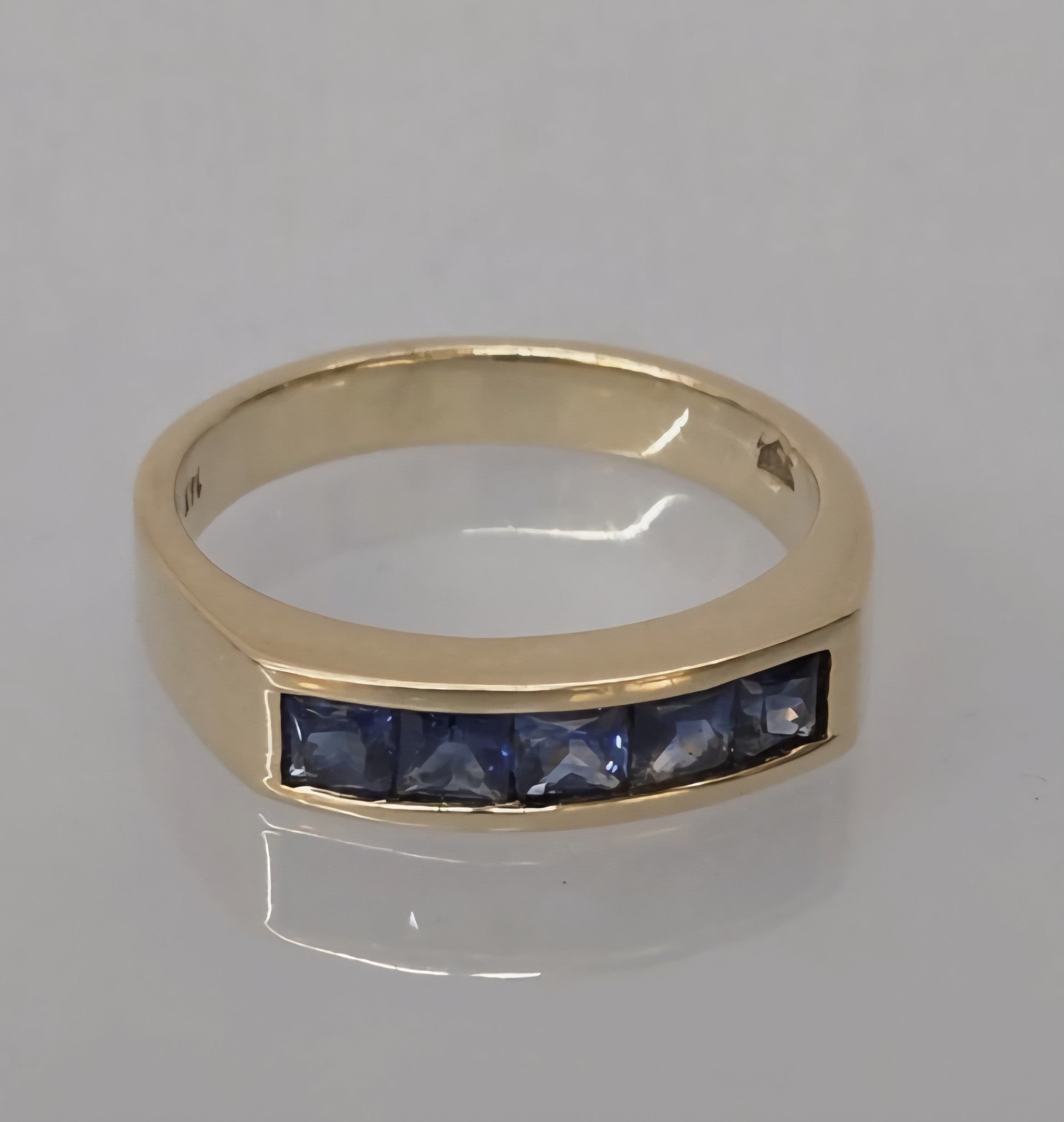 Custom making of 10k white gold ring with 5 blue sapphire stones, square cut 3,5 mm in size.